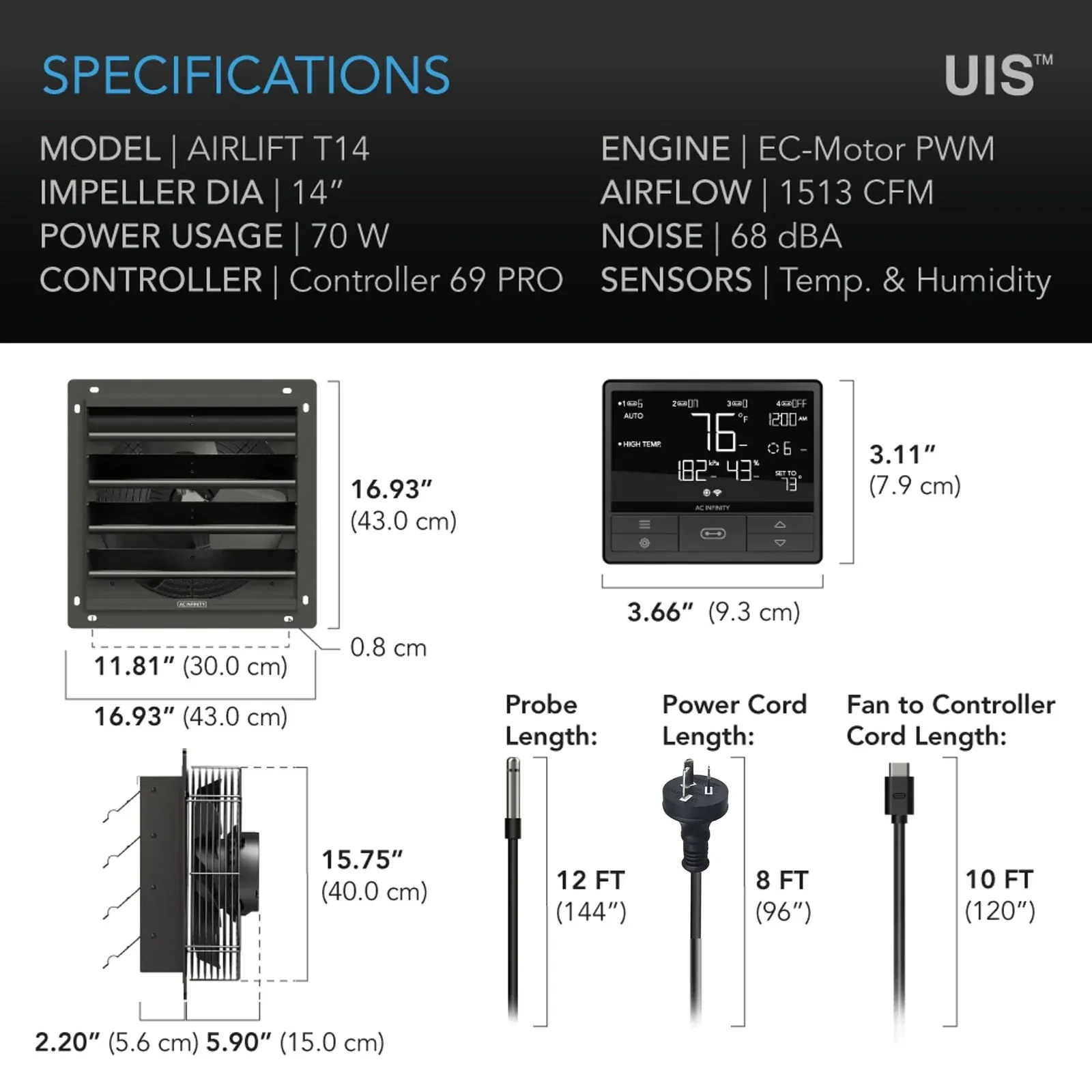 • [1] x AC Infinity Shutter Exhaust Ventilation EC Fan Airlift T14 - 350MM (14" Inch) w/ Temp & Humidity Controller 69 PRO