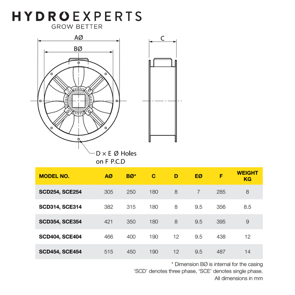 The Fantech Short Case In-Line Axial Fan SCD354 is designed for performance, efficiency, and durability in commercial and industrial ducted ventilation systems. With a 350MM (14" Inch) 4 Pole 3 Phase motor, it delivers an impressive airflow capacity of 2686  M³/H while maintaining a quiet sound level of 45 dB(A) @ 3m.