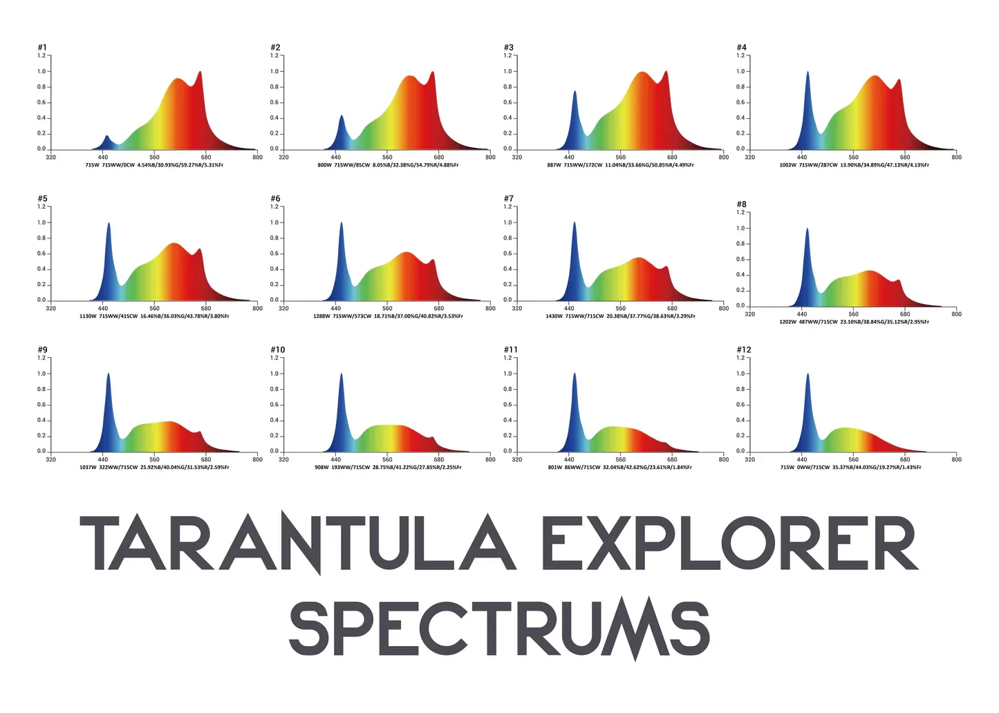 The Explorer runs two adjustable channels driven by a mixed LED configuration (9000K + 2200K + 660 nm) to fine‑tune veg‑to‑flower balance. The manual includes 12 spectrum possibilities (see SPD charts on pages 5–6) so you can match crop stage and phenotype with confidence.