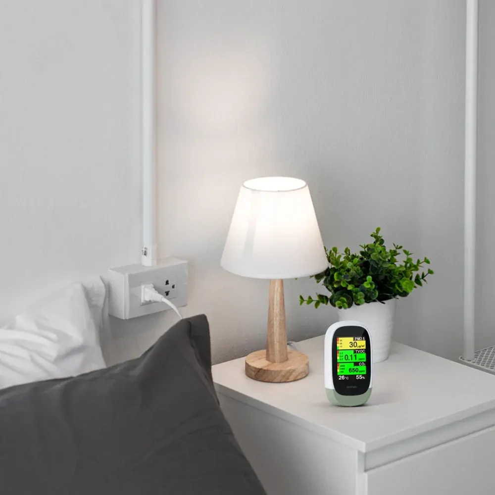 • Comprehensive Air Monitoring: Measures PM2.5, TVOC, CO2*, temperature, and humidity in real time.