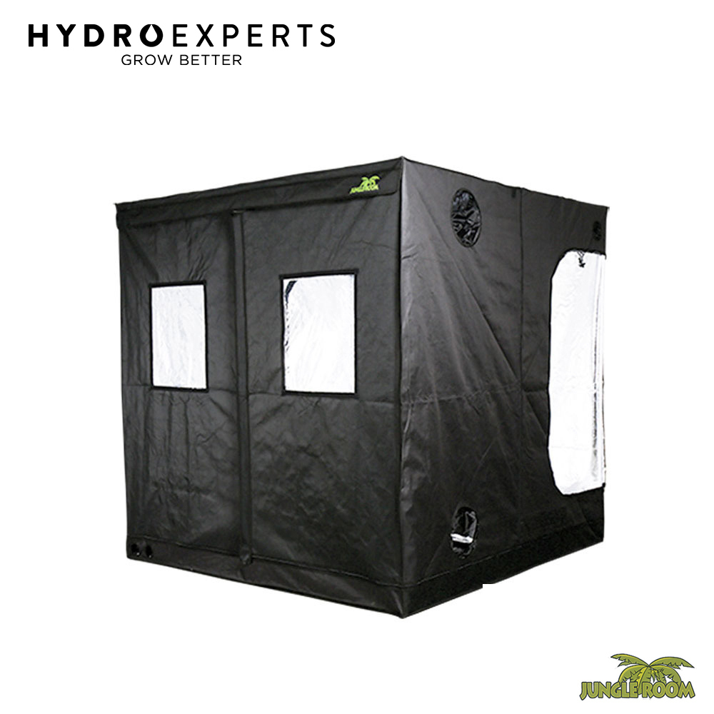 Jungle Room tents are heavy duty, featuring 19MM diameter all-steel constructed frames and corners, for long term reliability. Each frame will securely hold up to an extraordinary 80KG of lighting, fans and air filters. They heavyweight, lightproof outer and highly reflective mylar inner means maximum light efficiency. And, with both easy glide zippers and outlet drawstrings, any nutrient odours are sealed inside. The 250MM duct outlets and lower air flaps have been perfectly positioned to allow closed loop air-cooled lighting and internal air circulation, vital for vigorous plant growth. To maintain the perfect environment while checking on plant progress, there are large velcro flaps viewing windows. The jungle Room range also features 9 standard height and 6 industry-leading higher ceiling tents.