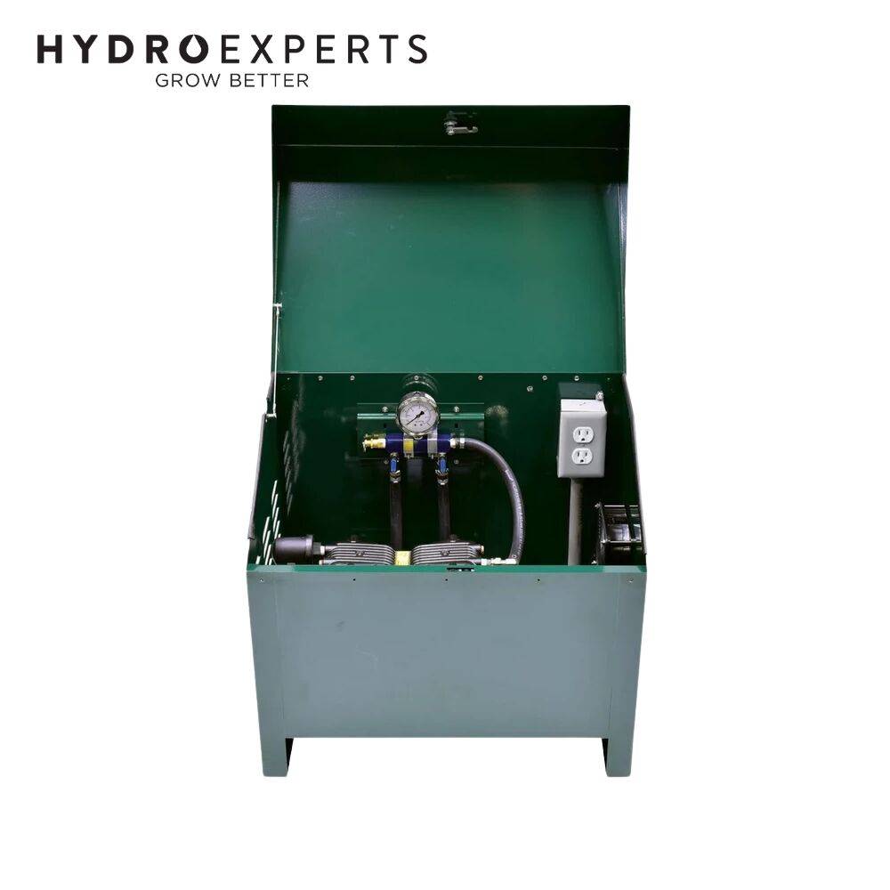 At the heart of the system is a reliable 1/4 HP Rocking Piston Compressor housed inside a Deluxe Locking Cabinet with integrated cooling fan and sound-deadening foam. This ensures cool, quiet, and efficient operation even under demanding conditions.