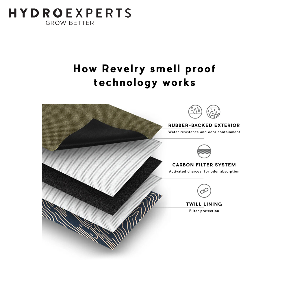 Say goodbye to unwanted odours with the Revelry Around Towner's top-of-the-line Carbon Filter System. This system is designed with three layers of filtration: two synthetic outer layers and a middle layer of activated charcoal. Together, these layers work to soak up and neutralise odours, ensuring that whatever you pack inside stays discreet. The heavy-duty rubber backing adds an extra layer of protection, creating a barrier that not only traps odours but also makes the bag resistant to water.