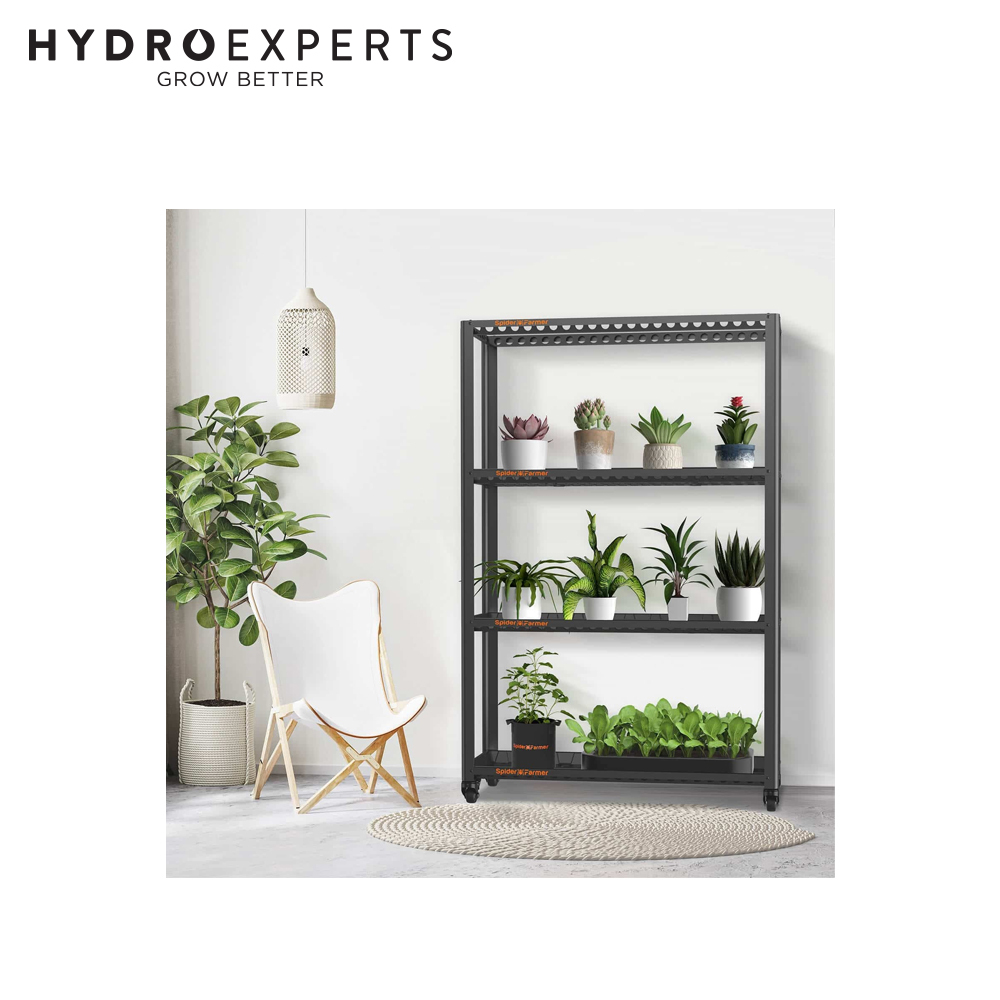 The Spider Farmer plant stand features a user-friendly design, comprising a shelf, support bar, waterproof tray, and casters. Setting up or disassembling this plant stand is a breeze, taking less than 20 minutes and involving just four easy steps. Once assembled, utilize the removable dual-locking wheels made of non-marking polyurethane, ensuring shock absorption and preventing floor marks, to effortlessly relocate the stand according to seasonal or lighting requirements.