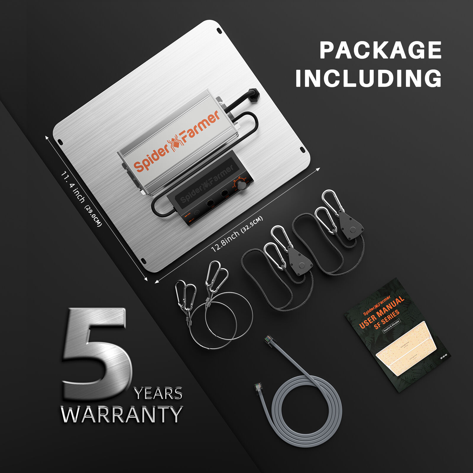 Spider Farmer: Your Trusted Partner in Plant Growth: With over a decade of experience in LED grow lights, Spider Farmer is committed to creating efficient, suitable, and high-quality home planting equipment. We aim to be the trusted partner of every grower. When you choose the Spider Farmer SF1000-EVO, you'll receive the grow light itself, an instruction manual, a pair of silver hooks, and a pair of black hangers.