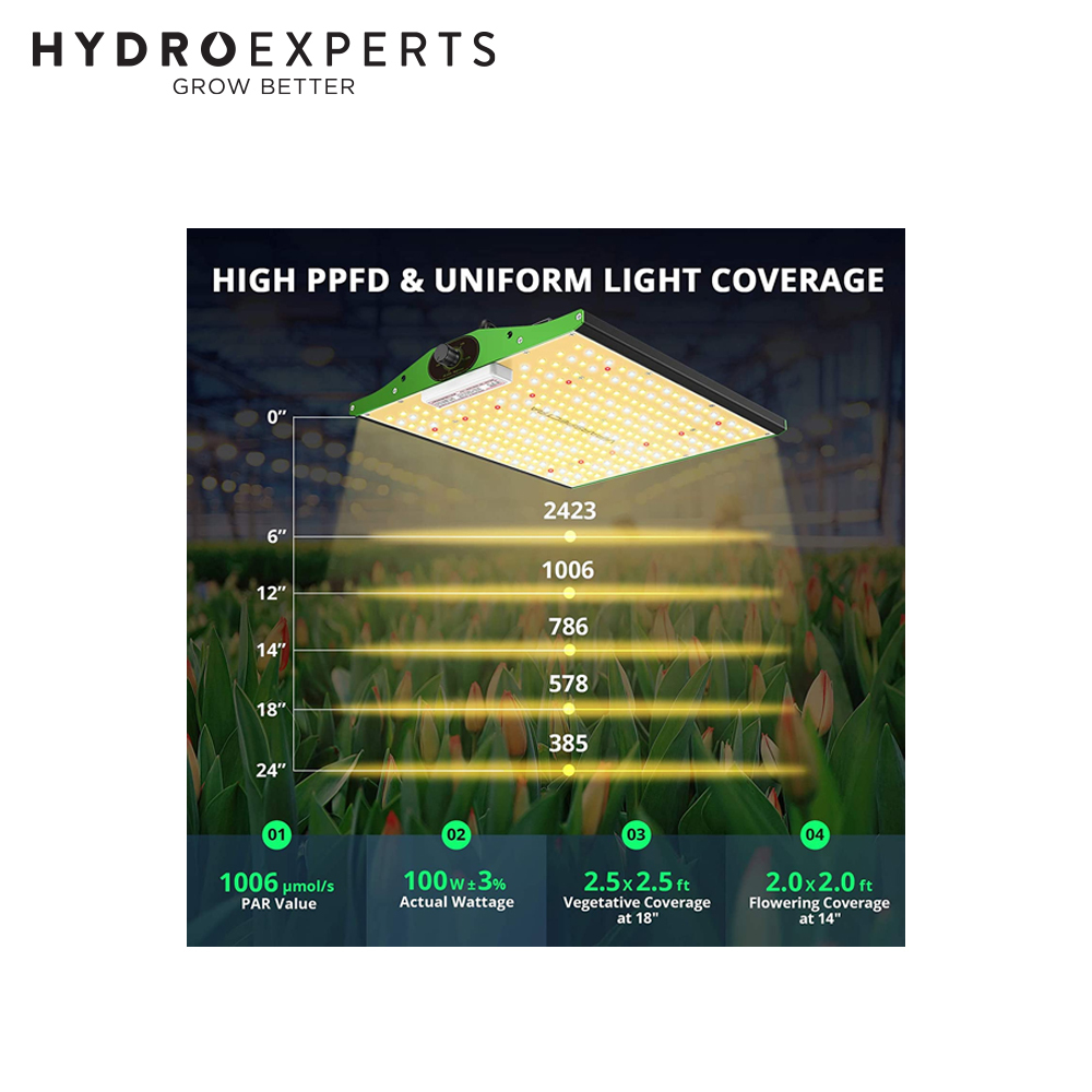 - The Dimmable P1000 LED grow light is perfect for 2.5’x2.5’ vegetative coverage at 20” and 2’x2’ flowering coverage at 16”. Remember to properly adjust the height and brightness accordingly to your plants desired level for optimal growth.