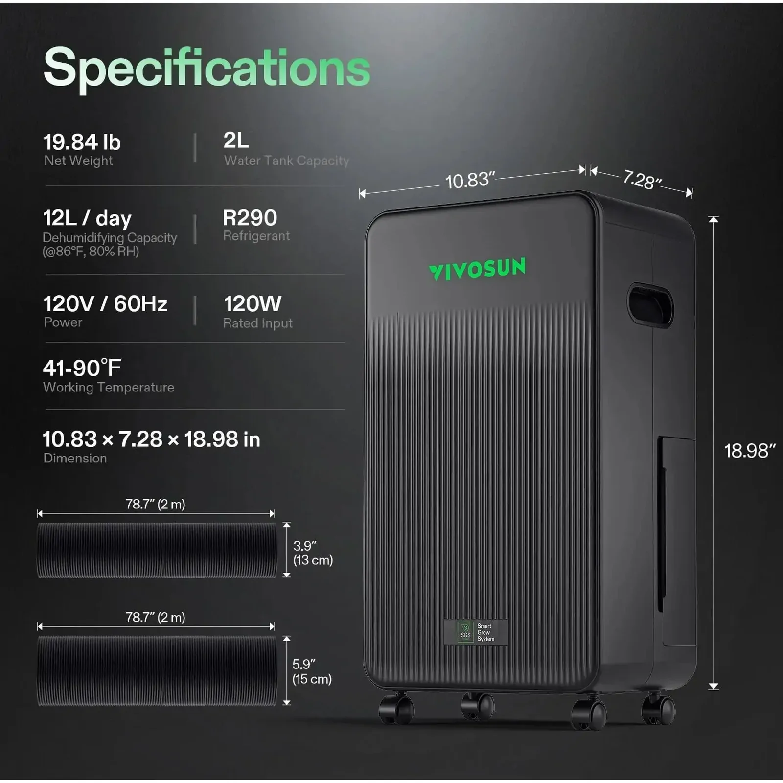 The Vivosun AeroDrain D12 is a compact, high-efficiency dehumidifier engineered specifically for indoor grow tents and controlled plant environments. Designed for spaces up to 1.5 × 1.5 meters (5×5), the D12 provides stable humidity management with smart environmental monitoring, VPD insights, and seamless integration with the Vivosun Smart Grow System.
