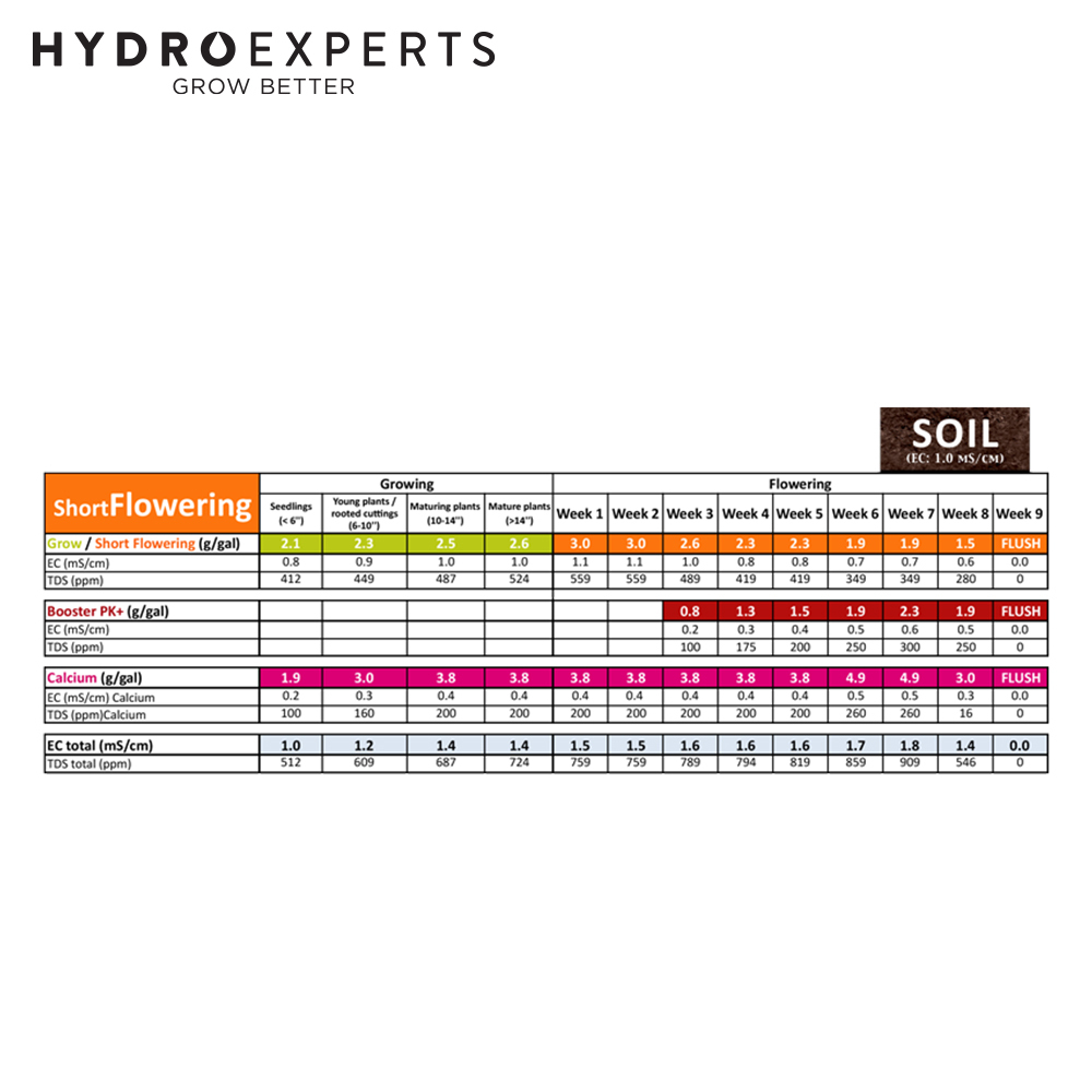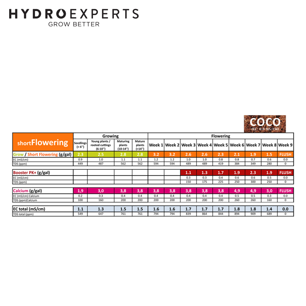 • Designed specifically for the growth and flowering stages of those plant varieties with a short flowering time, 8 weeks or less.