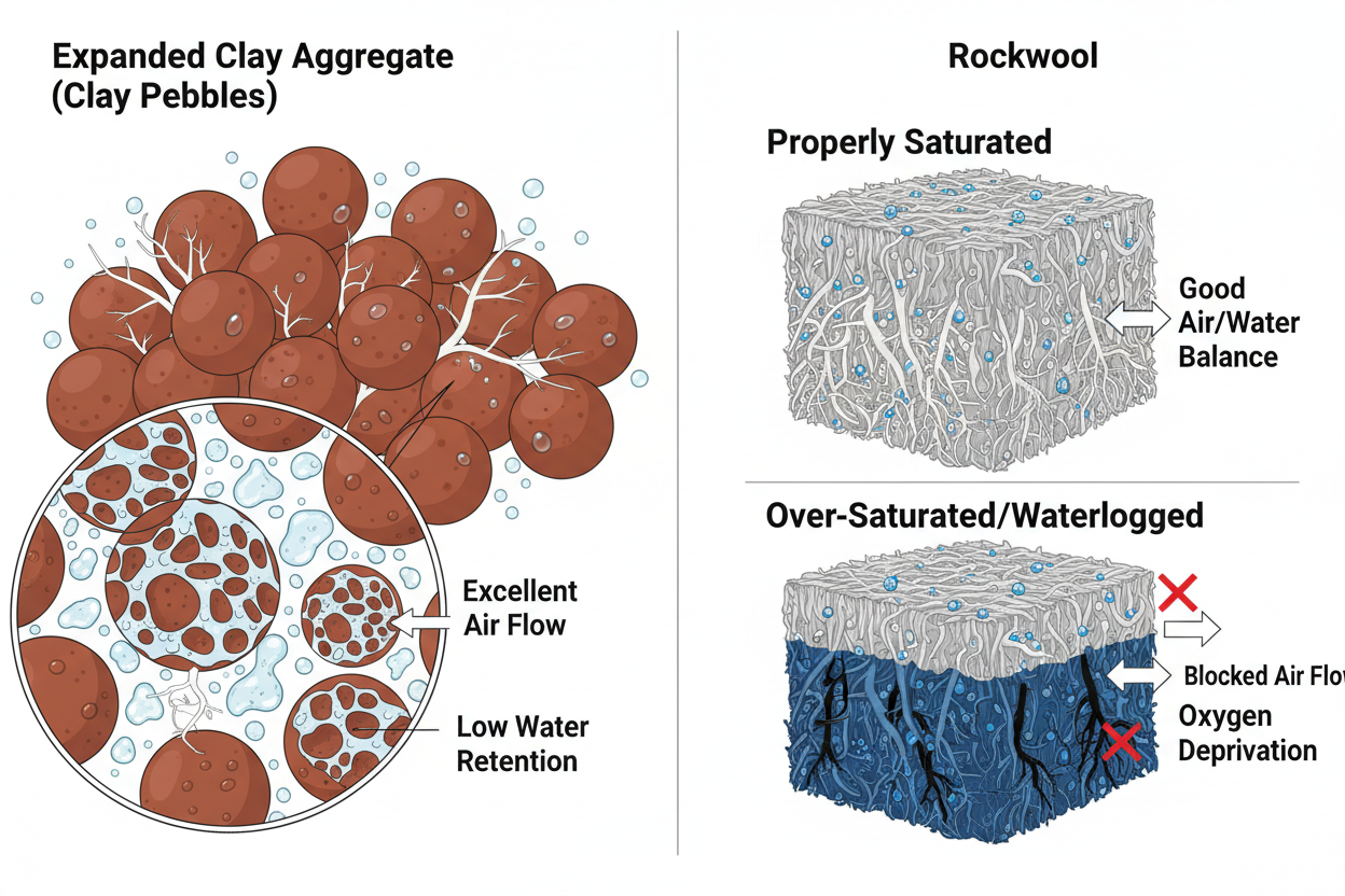 The choice of grow media affects how much air reaches the roots. Clay pebbles have a high porosity and allow for excellent air flow. They do not retain much water, which necessitates frequent irrigation. Rockwool holds a high volume of water but can become waterlogged if over-saturated. This blocks oxygen from the root zone.