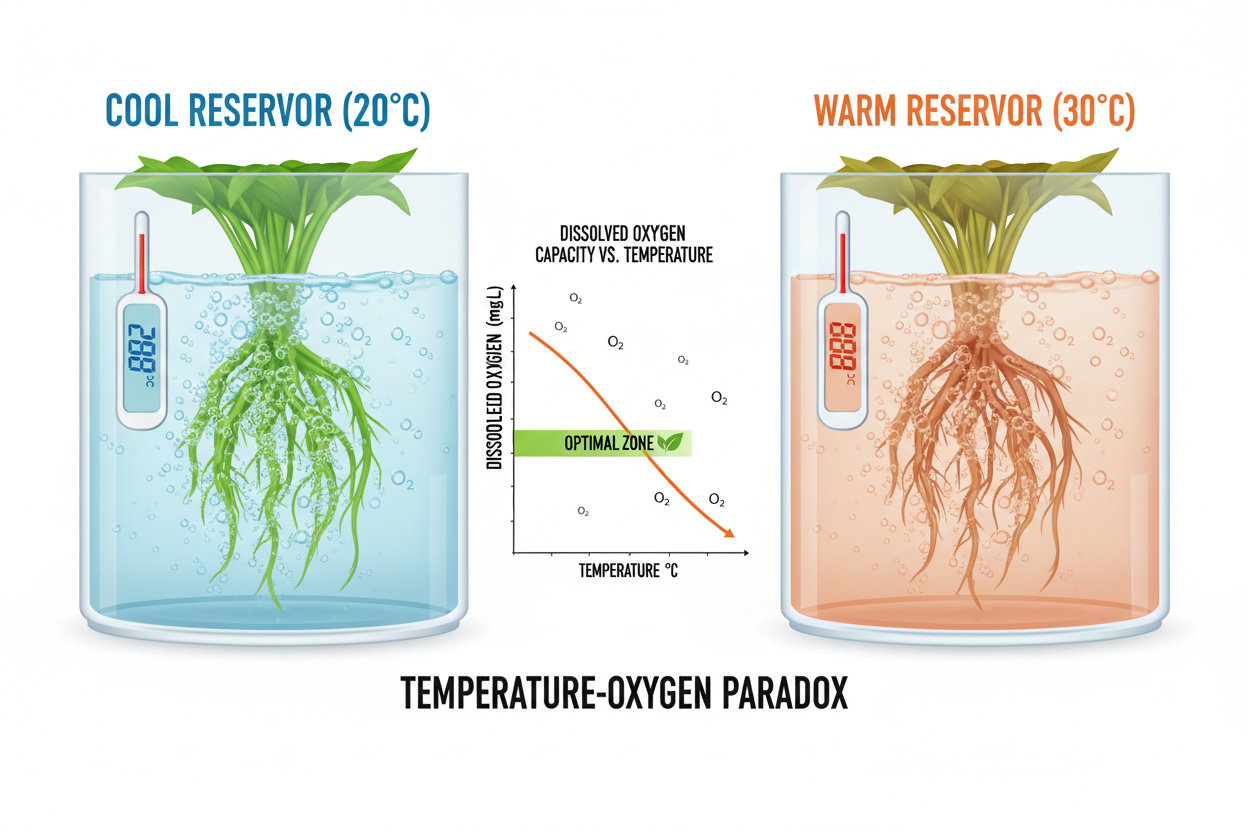 However, plant metabolism increases with temperature. This creates a paradox where the plant needs more oxygen as the water becomes less capable of providing it. Maintaining the reservoir between 18 and 22 degrees Celsius optimizes both oxygen levels and metabolic rates. Chiller systems are often necessary in Australian climates to keep water within this functional range.