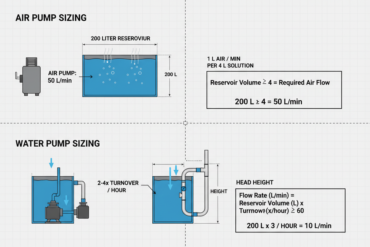 Sizing an air pump involves calculating the volume of the reservoir. A standard ratio is one liter of air per minute for every four liters of nutrient solution. For a 200 liter reservoir, a pump rated for 50 liters per minute is required.