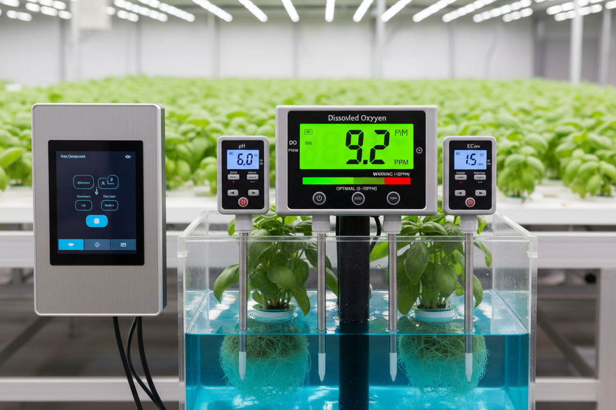 Electronic sensors provide data on the health of the system. A dissolved oxygen meter measures the exact concentration of oxygen in parts per million. Most hydroponic crops thrive at levels between 8 and 10 ppm. If the levels drop below 5 ppm, the plants are at risk. pH and EC meters monitor the nutrient balance.